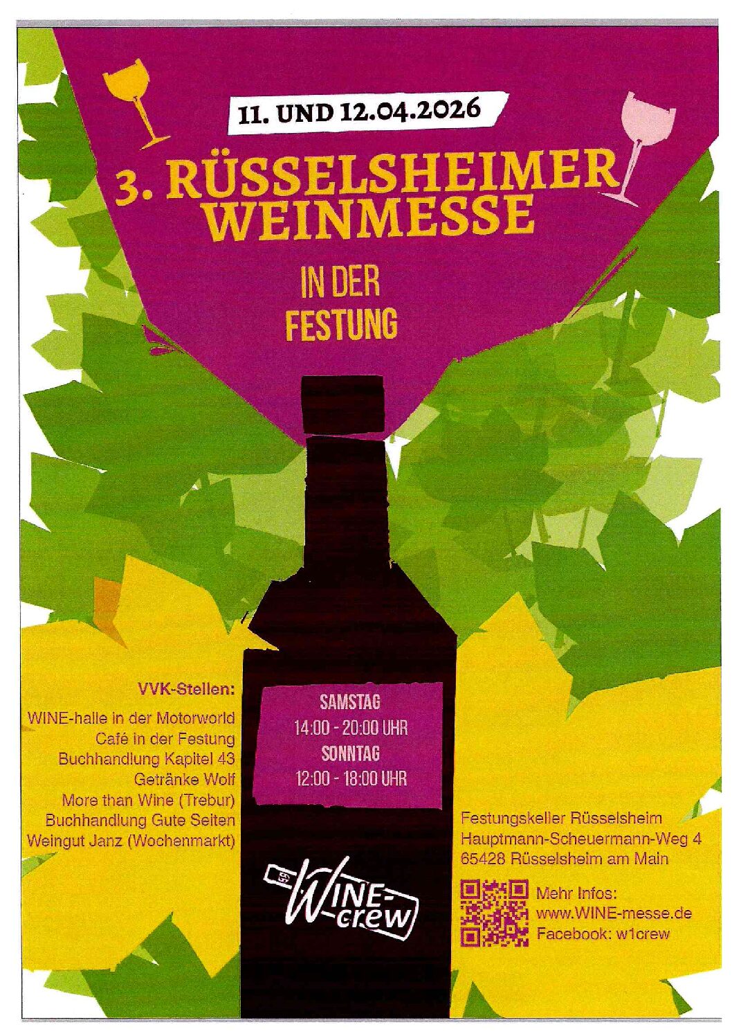 Wir freuen uns auf die 3. Rüsselsheimer WINE-messe am 11. und 12. April 2026. Hier wird Euch die WINE-Crew an den beiden Tagen überregionale Weinanbieter im Gewölbekeller der Rüsselsheimer Festung präsentieren.